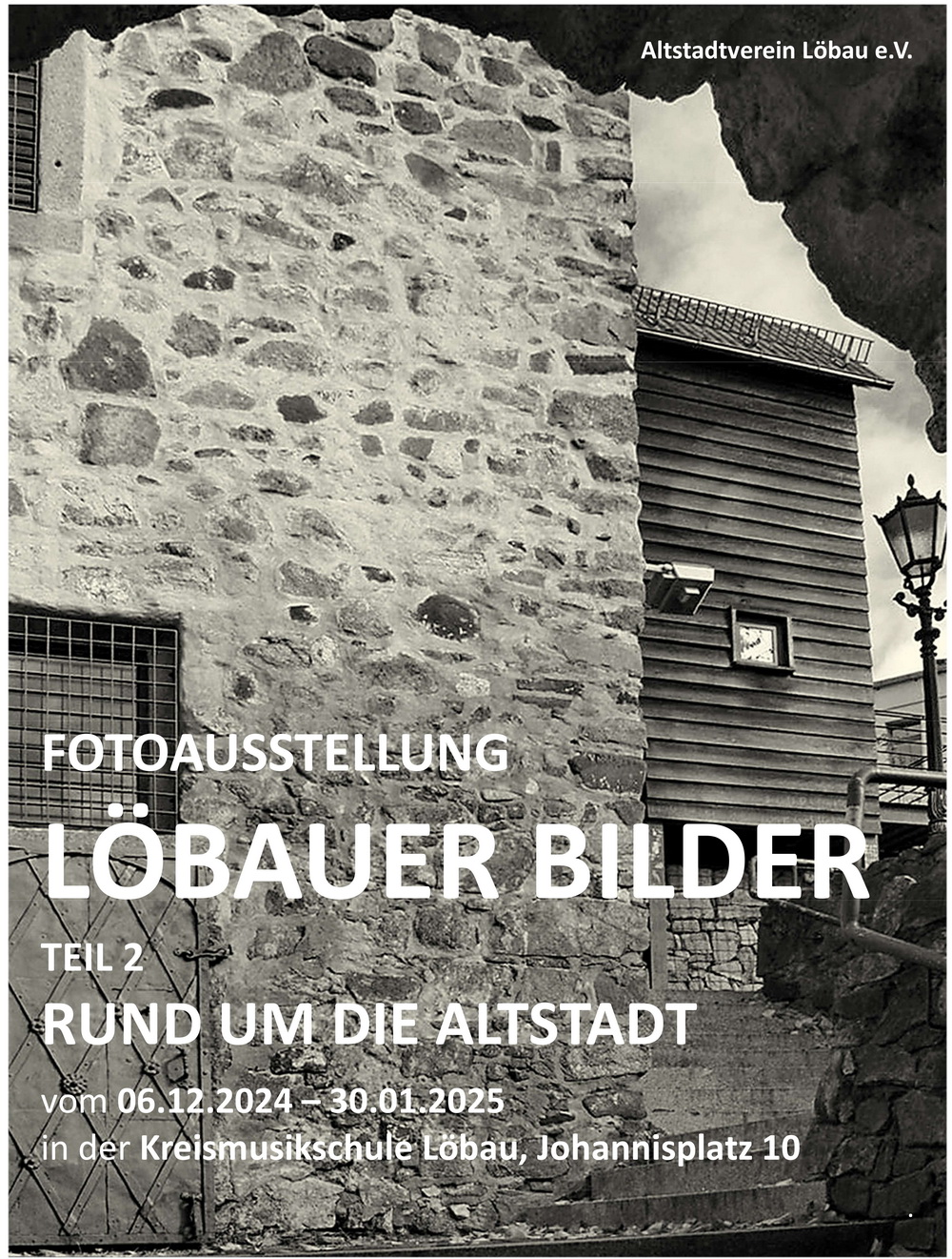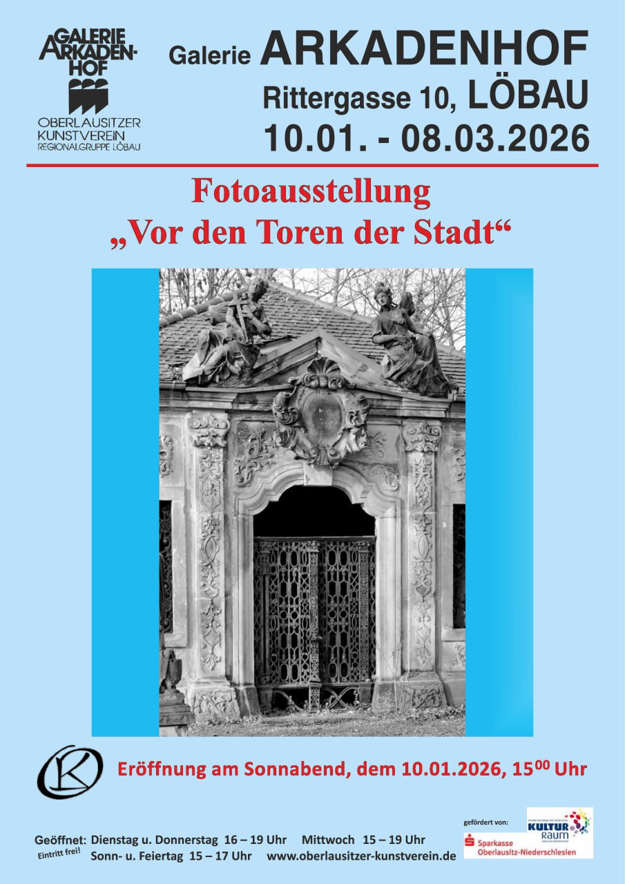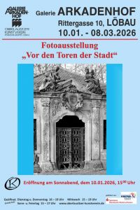 Der Oberlausitzer Kunstverein zeigt in der Galerie Arkadenhof die dritte Folge der Ausstellungsreihe LÖBAUER BILDER des Altstadtvereines Löbau e.V. mit dem Titel "Vor den Toren der Stadt". Zu sehen ist die Fotoausstellung vom 10.01. - 08.03.2026 in den Räumen der Galerie Arkadenhof, Rittergasse 10 in Löbau zu den üblichen Öffnungszeiten: