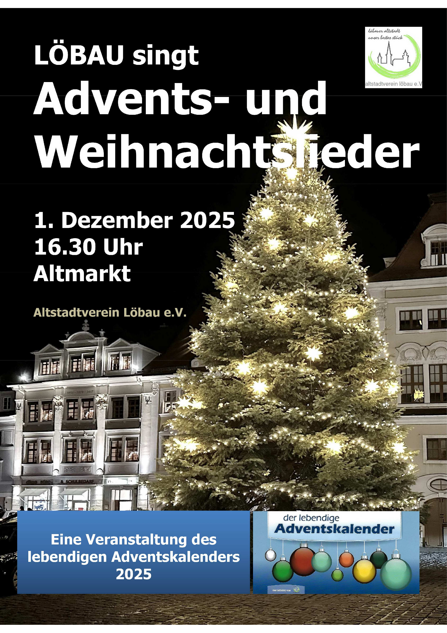 | Montag | 01.12.2025 | 16.30 Uhr | Altstadtverein Löbau e.V. | Altmarkt | "Löbau singt Advents- und Weihnachtslieder" |